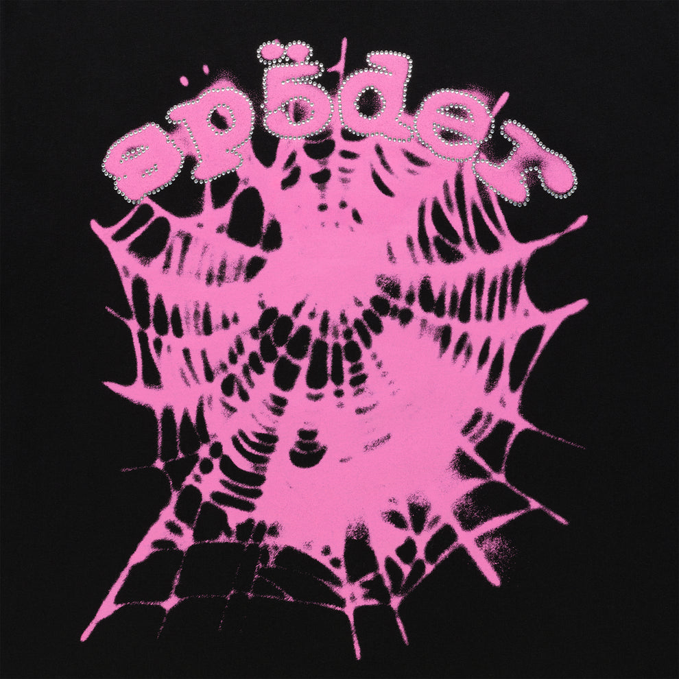 "SP5DER" text print on front lined with rhinestones.