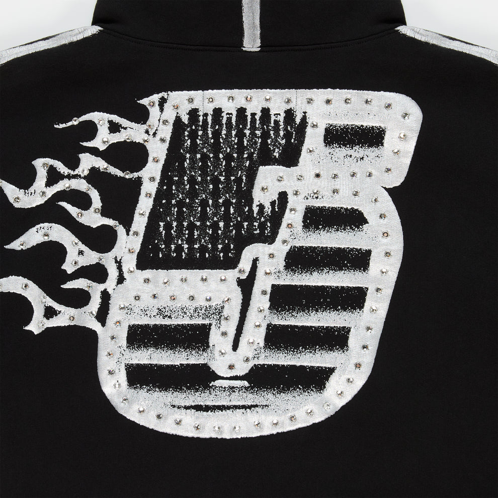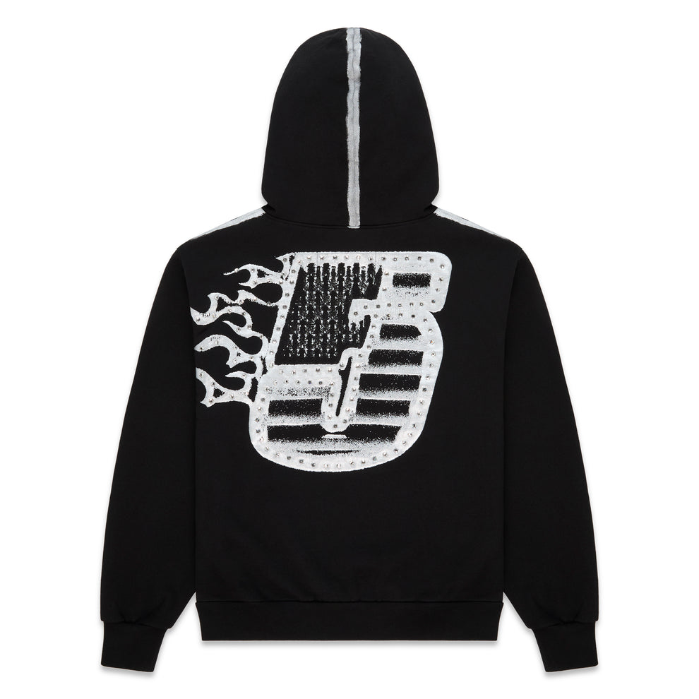 Flaming “5” with rhinestones on back.