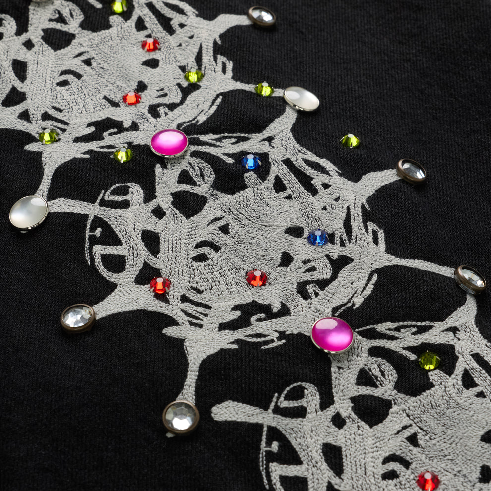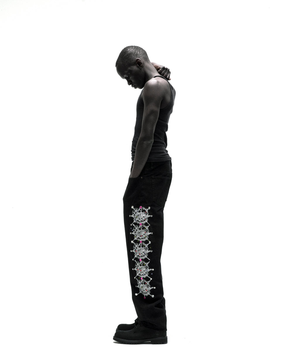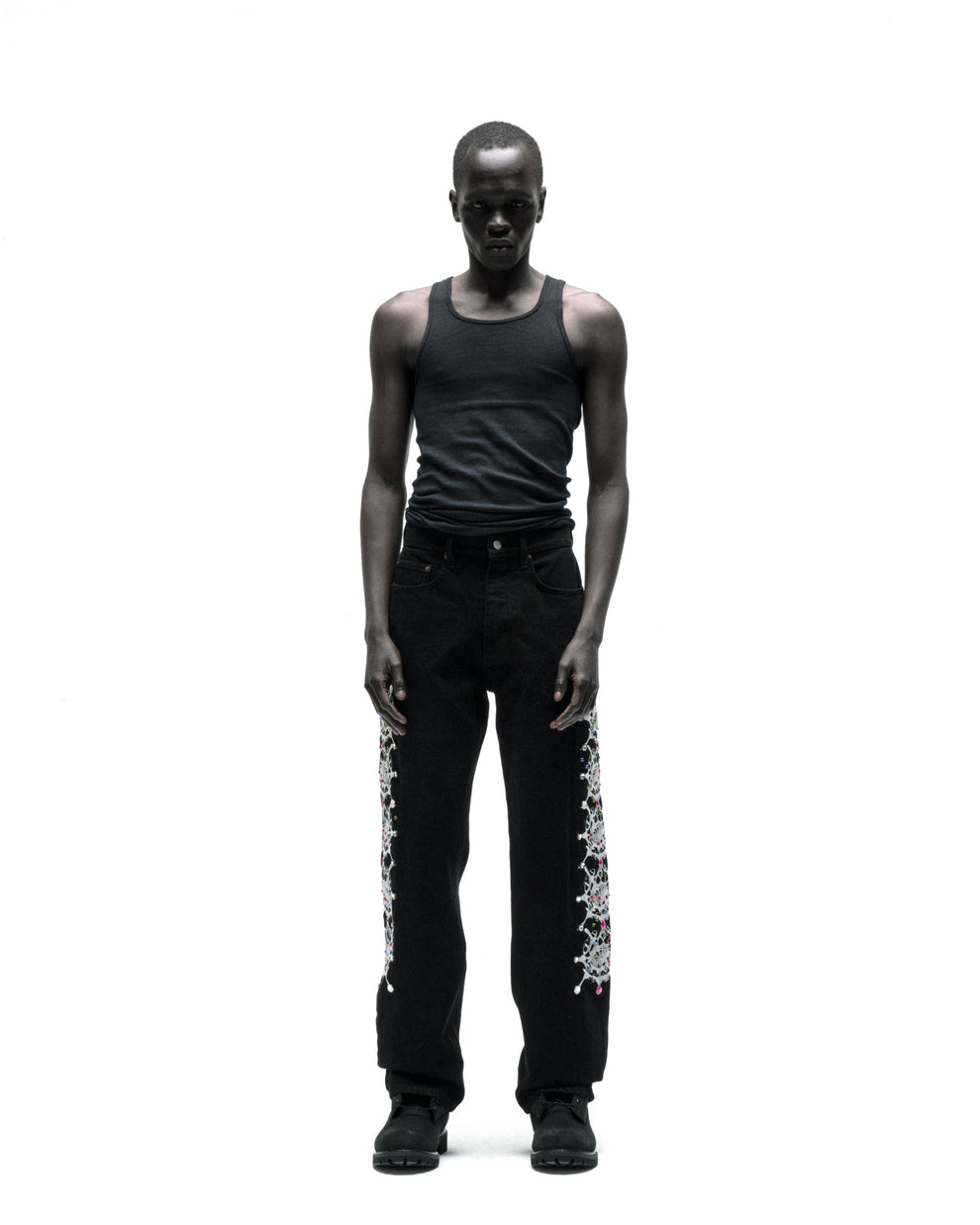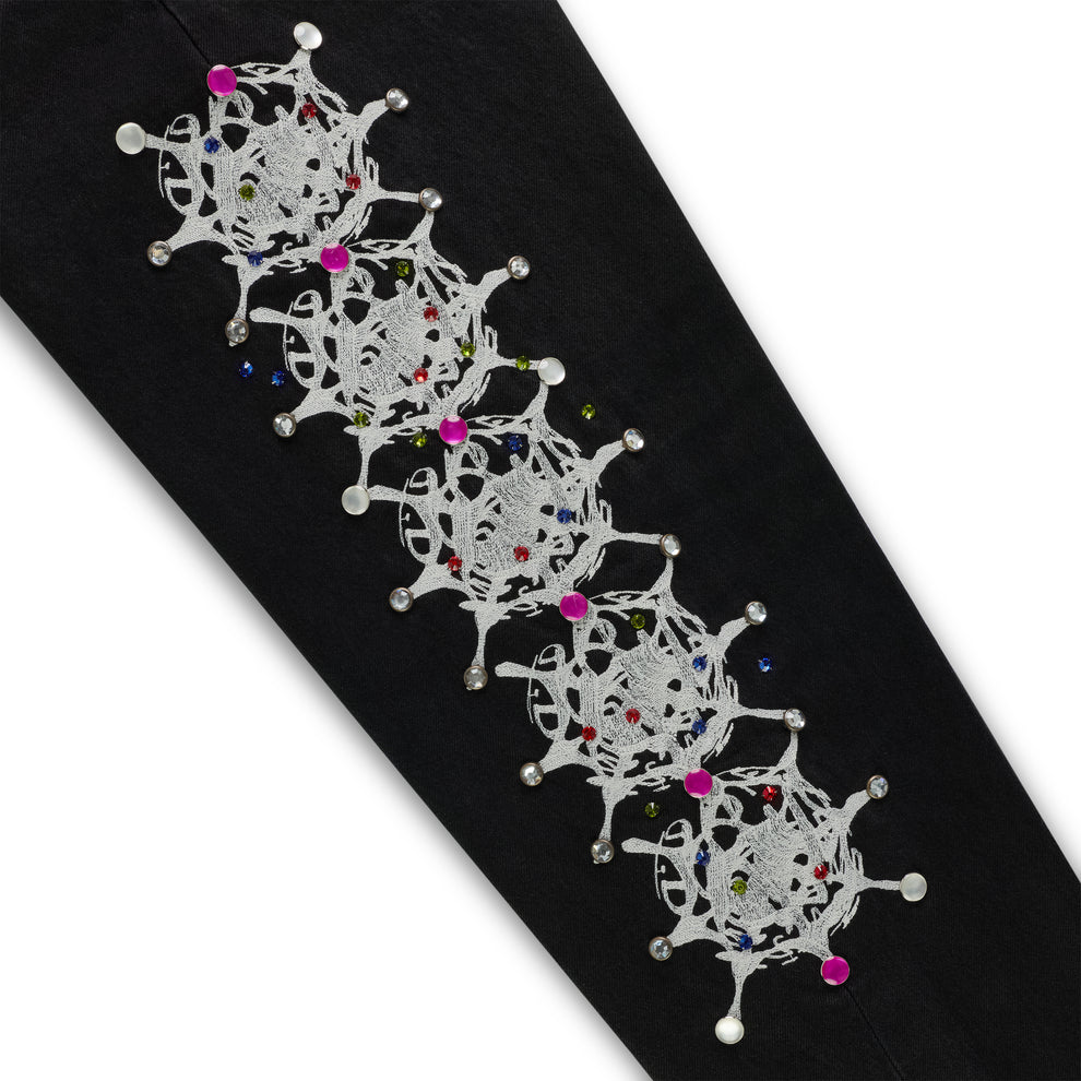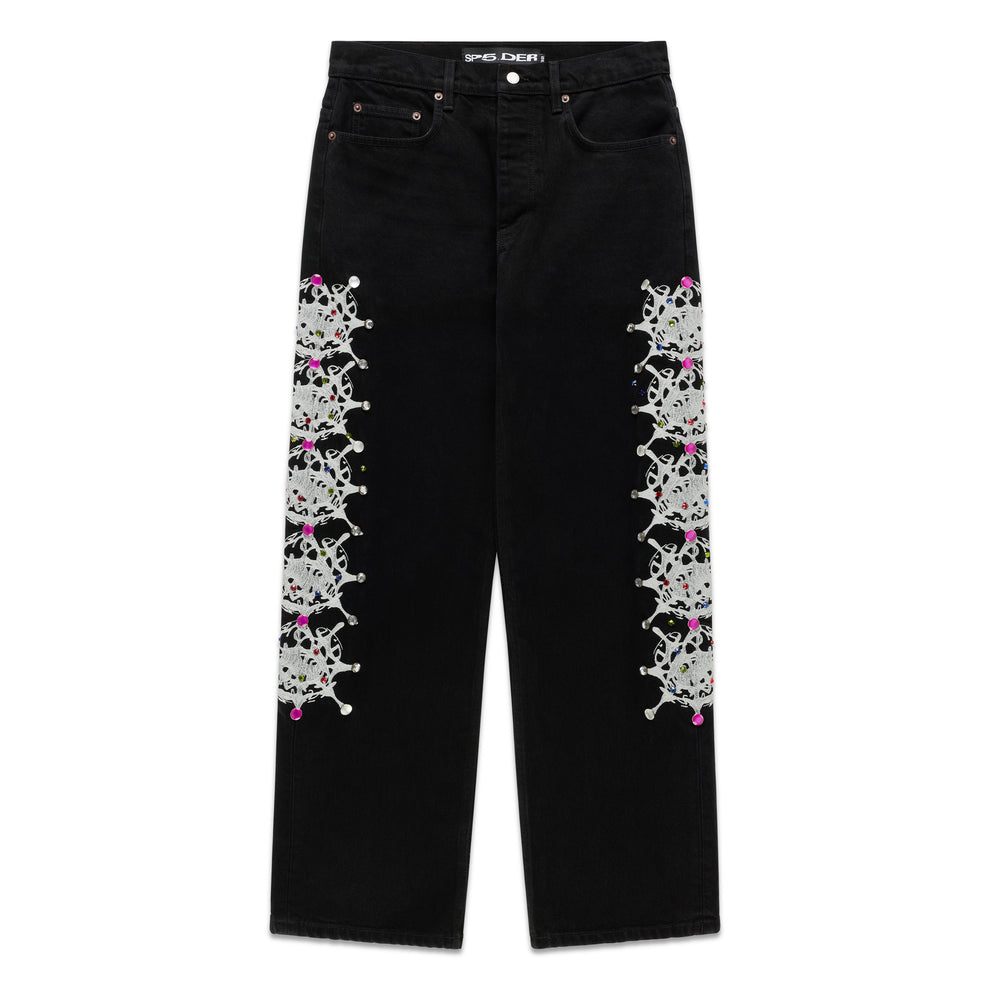 Web print design and rhinestone embellishment down both legs.