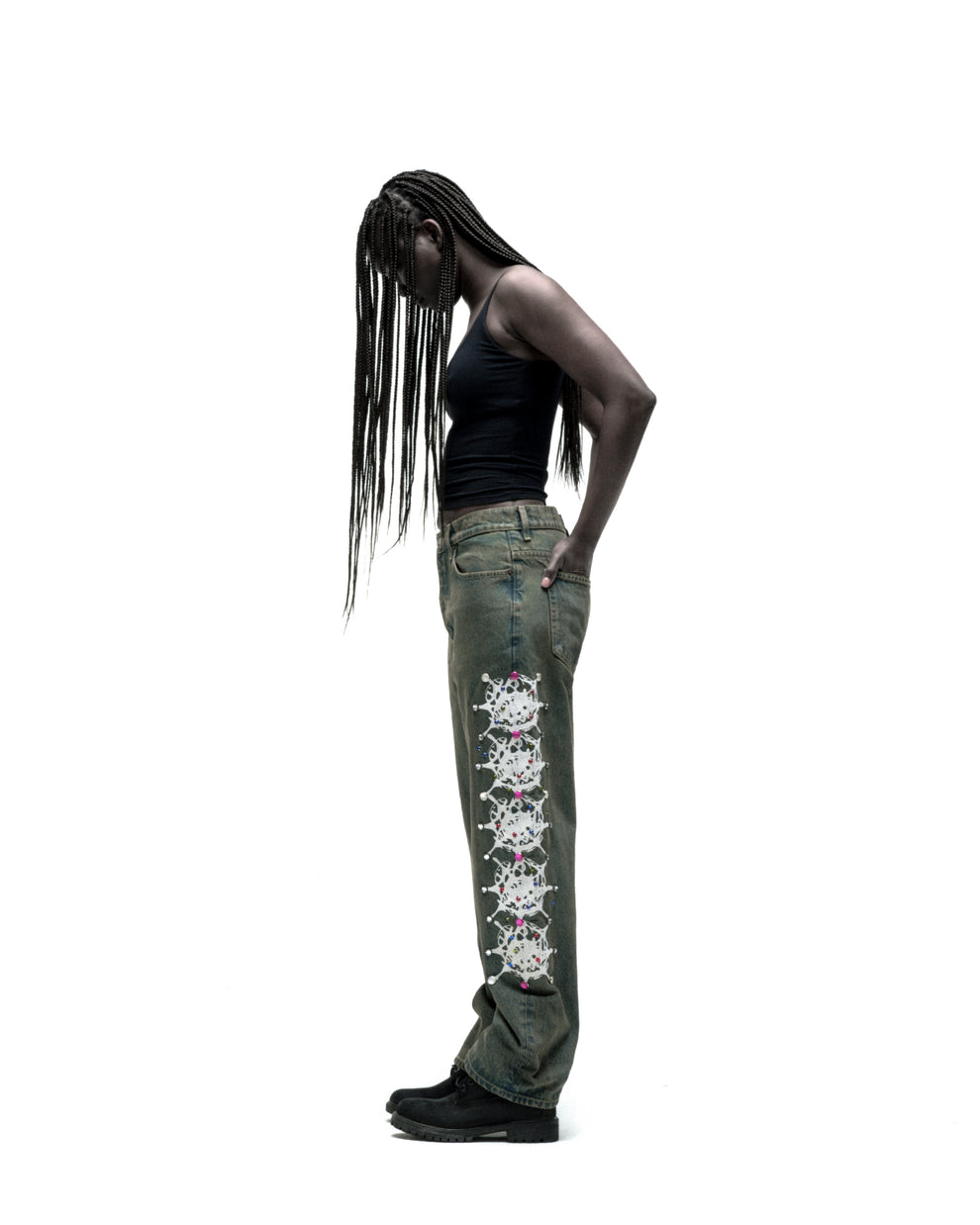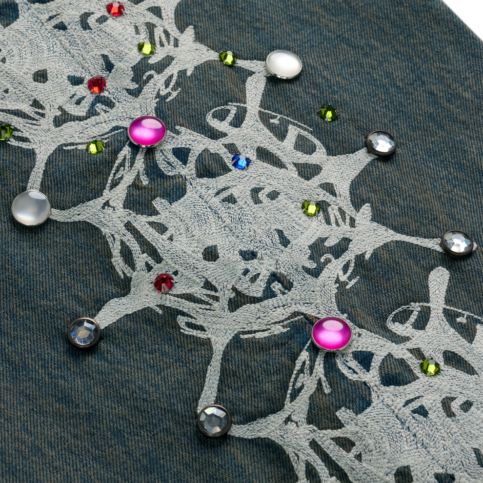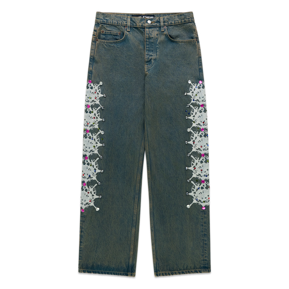 Web print design and rhinestone embellishment down both legs.