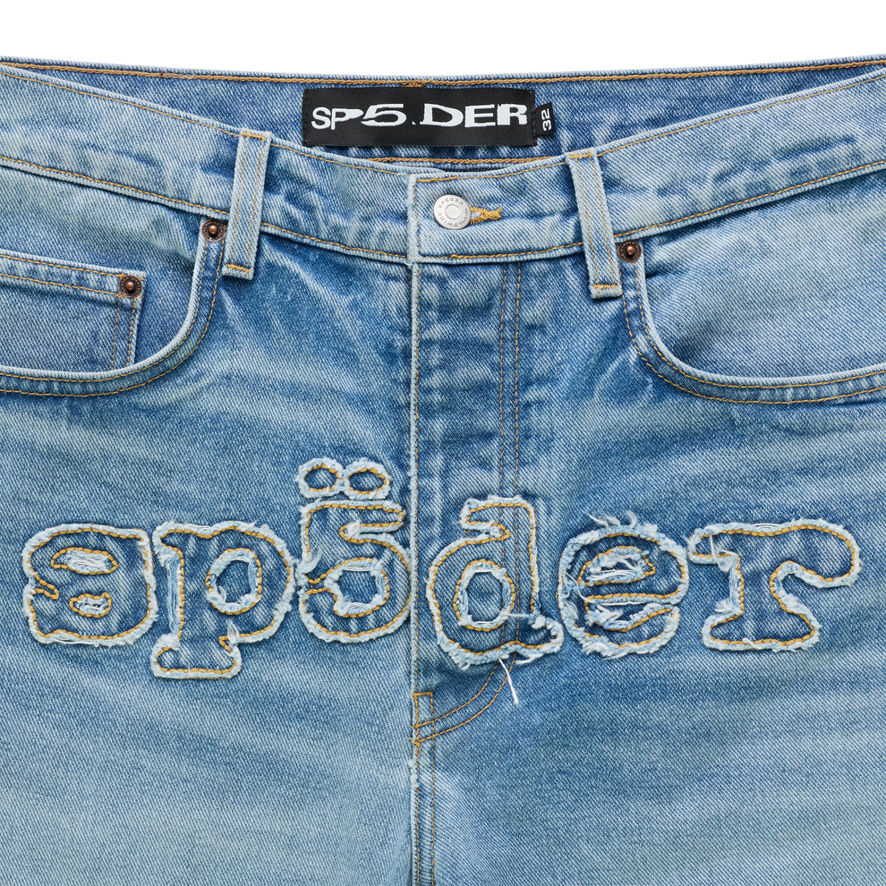Signature frayed embroidered “SP5DER” logo across crotch.